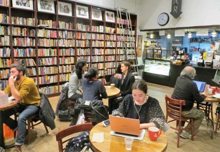 Literary Tourist in New York: The day didn't start off with a bang. Quite the contrary. The early morning meeting I'd set up had been cancelled. I was stranded down at 5th and 14th with several empty hours yawning in front of me. I decided to stroll up 5th Avenue towards Times Square to see what I could see.This was a good startAfter passing a sign of the times,I hit Broadway where I re-encountered Rizzoli Bookstore at it's newish location. It was for years on 57th Street in an elegant six story townhouse, here it continues to specialize in illustrated books on architecture, interior design, fashion, photography, cookery, and the fine and applied arts, as well as literature, and foreign language books; the store also carries European magazines and newspapers and a delightful selection of note cards and stationery.Further along Broadway I came across this appealing combination: free books and free musicThis walk along Broadway reminded me of my first visit to NYC back in the eighties with my friends Pat Grew and Ann Stoner. It was late at night. We had the street to ourselves. Starting right at the bottom of Manhattan we walked all the way up to and past The Lincoln Center. It was hot and Ann's shoes were bothering her, so she took them off and went barefoot. You should have seen the colour of the soles of her feet by the time we got to our destination. Soot black they were. No idea how long it took to get them back to normal. Months I'm sure.It began to rain, so I decided to hop on the subway (I'm likin' some of the artthat decorates the walls) with my convenient three-day pass, and check out one of the places where writers must hang out in New York: the lobby of the Ace Hotel at 20W 29th Street, just off Broadway.All the seats in the pit were taken so I pulled up part of a sofa near the bar ordered a beer and nursed it for about an hour as I observed the scene, surfed the Net and jotted down some notes. Pretty well everyone wore ear-buds. The music (techno-ish) was fairly loud. Not sure I'd be able to write much here. But, certainly, there were lots of writer types present, and one definitely needs to get out of the garret now and again.Next stop, further up Broadway at 12th street, was Strand Bookstore - one of the greatest, most iconic stores in the world. Here I searched for Jonathan Galassi's (more on him later) first book of poetry. Had to settle for the second, signed "with best wishes to Debbie." The main floor was packed with people buying books and cool, useful accessories, such as theseTrump Hands, so I escaped up to the Third, where you'll find the rare book room, one of my favourite places in the world. I once pulled an American First of Mordecai Richler's Apprenticeship of Duddy Kravitz out of here for U.S. $40. I like to think that it's worth way more than I paid. The cover is by Leonard Baskin. Some years ago I interviewed current owner Nancy Bass Wyden about the store and secrets to its longevity. Listen hereNext it was back down to The Housing Works, where you'll find lots of used books and a generous-sized cafe.Since it was just around the corner and I'd heard a lot about it, I dropped in to McNally Jackson. Can't say I saw anything out of the ordinary. Perhaps they have a good reading series. Perhaps it's the cool surrounding neighbourhood. Lots of small boutique shops and trendy ethnic restaurants.The weather had cleared, thankfully, and it was time to head over to Times Square.I arrived in time to meet up with my loved ones, and catch the evening bus tour to Brooklyn. What a magnificent view of the Manhattan skyline.For information on planning a trip to New York City, click here.More.Times Square photo by Caroline Liguori