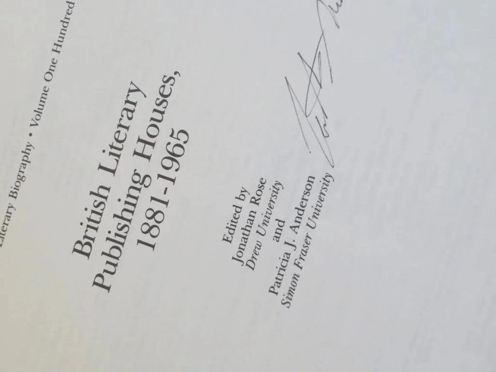 and seeing that he was its editor. This book, along with companion volumes on American publishing houses became collecting bibles for me. At the end of each publishing house entry there's a short bibliography listing sources. Pasteing them together provided me with my early publishers' histories/memoirs hit list. Today many of the listed titles sit on my shelves. Naturally, as you can see, I got Jonathan to sign my copy.