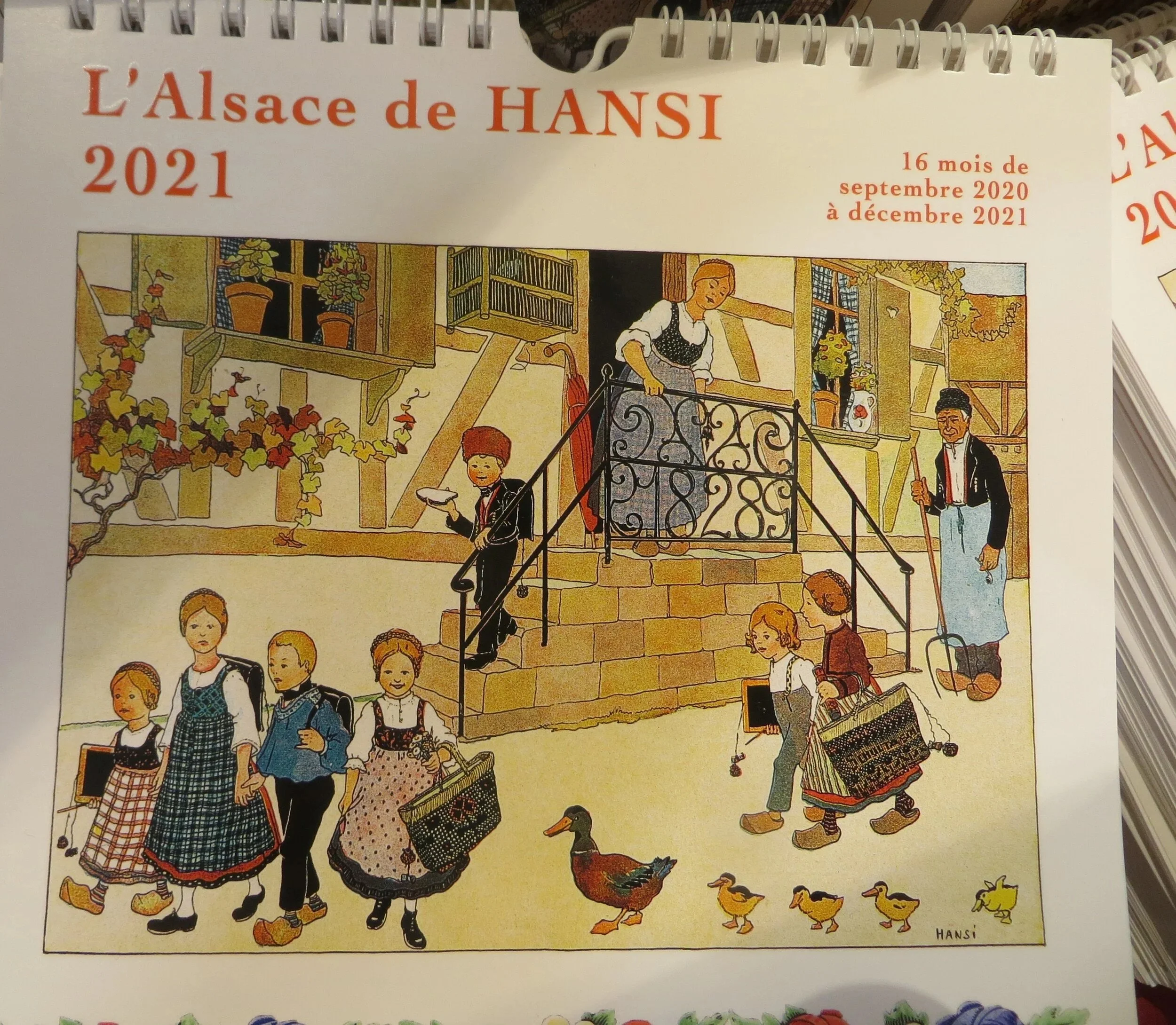 Next morning we drove into Colmar, home of ‘Hansi’ (Jean-Jacques Waltz, 1873 -1951), a staunch pro-French activist famous for his charming drawings, many of which contained harsh critiques of the Germans, especially burly German tourists. Born in Colmar following annexation of Alsace by the German Empire in the Franco-Prussian War of 1870-1, Waltz worked as an artist in the textile business and illustrated postcards and programs for local festivals and events. He started publishing satirical works in 1908 under his pseudonym and became famous after his polemic Professor Knatschke (1912) hit the bookstores. It was a best-seller, but not in Germany. In fact in 1914 the German authorities threw him in jail because of it. His one-year sentence caused a national outcry in France. He soon escaped though, joining the French military as a translator-officer. The Nazis were still after him during the second world war. He’s considered a national hero in France, and of course, his books are very collectible.