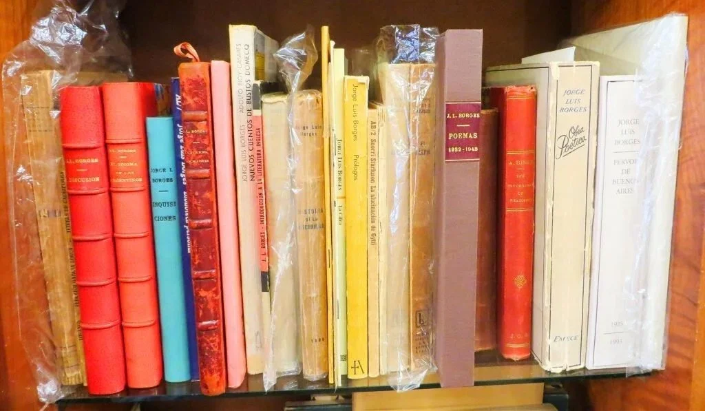 The next day I ventured downtown, past this overworked city employee, to visit Alberto Casares Antiquarian & Modern Books at Suipacha 521. Borges used to browse and buy and hang-out here. Here's a shelf of his first editions.