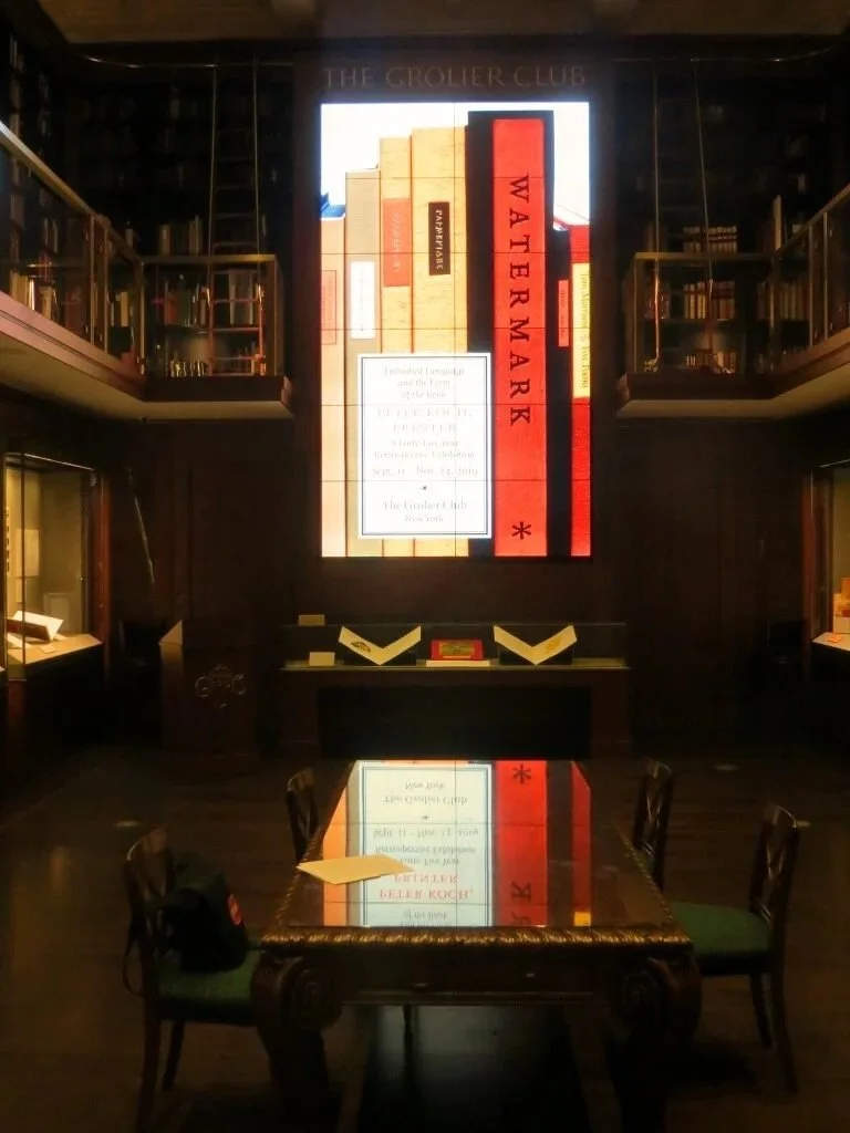 Next morning I headed over, on the overhead 'subway,' to the Grolier Club to take in the Peter Koch retrospective in advance of interviewing him at 10am. I followed the chronological exhibit around the room taking notes,