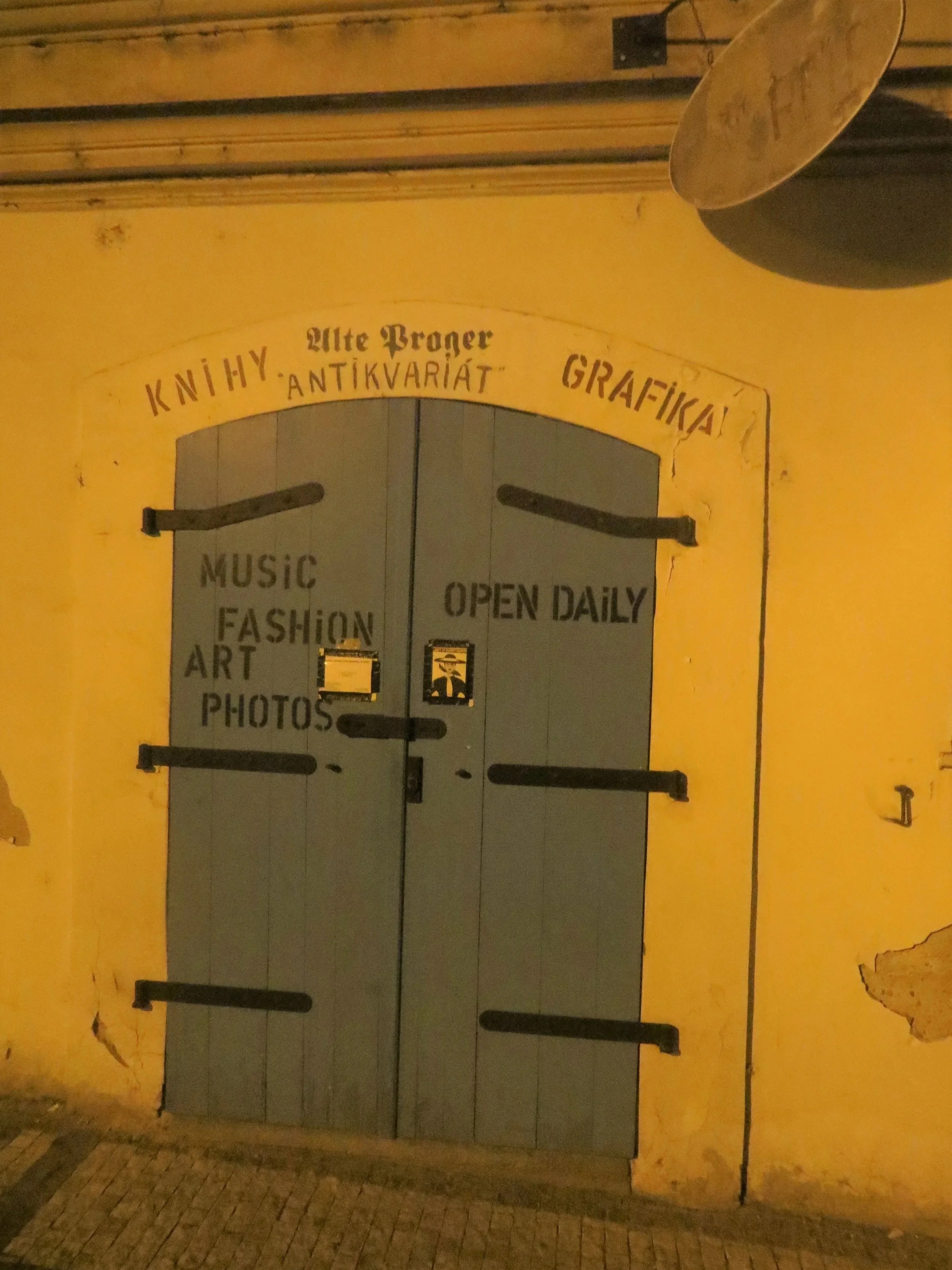 I arrived in Prague most recently just in time for Bloomsday. Dan had invited me to read some passages from Ulysses at his bookshop. We were joined by Bryn Haworth who founded the Irish Studies program at Charles University some thirty years prior during the early 1990s. After butchering the text, and analysing its fireworks with surprising acuity, the three of us headed over to a hill-side orchard near Prague Castle. After a time, we were joined by a crowd of Bryn’s ex-students. Many were seeing him for the first time in years. Watching the reunions and observing the respect that was paid to Bryn was a heart-warming experience. Set against such a spectacular backdrop it was, yes, surreally beautiful. Later that night, on the way home, down the hill, we passed this little bookshop: [ ]